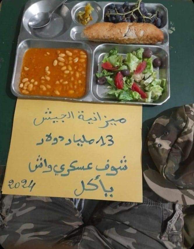 ونشر الجنود صورة يظهر فيها طبق غذائي بسيط لا يتناسب مع الميزانية المخصصة للجيش، ما سلط الضوء على التناقض الصارخ بين الإنفاق العسكري والوضع المعيشي المتردي للجنود.