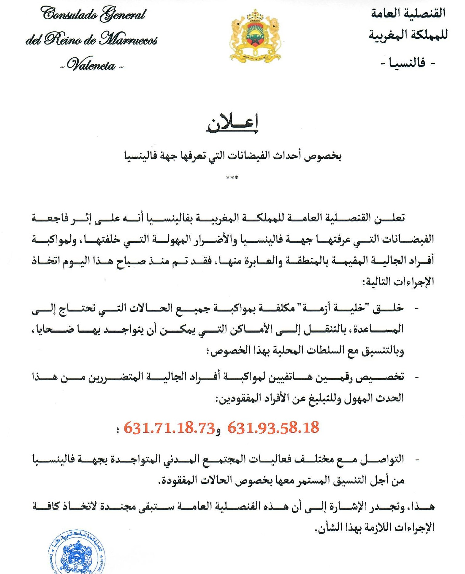 وحسب موقع "Atalayar" تفاعل القنصل العام للمغرب في فالنسيا، سعيد الإدريسي البوزيدي، مع تدعيات الفاجعة، عبر تفعيل خلية أزمة وتعبئة القنصلية لتقديم الدعم للمواطنين المتضررين من الفيضانات، وخصوصاً المواطنين المغاربة.
