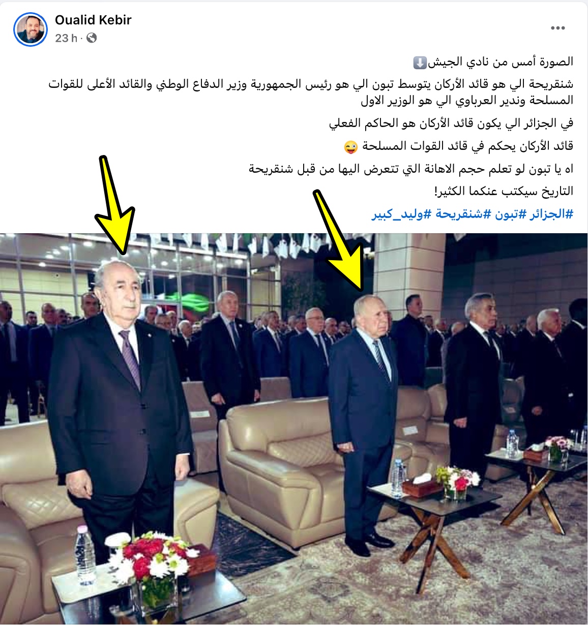 إلى هنا تبدو الأمور عادية، لكن ما ليس عاد تماما، هو ذلك المشهد المثير الذي تناقلته وسائط التواصل الاجتماعي بكثير من السخرية، والذي كشف للجميع بما لا يدع مجالا للشك، أن الحاكم الفعلي للجارة الشرقية هو الفريق الأول "السعيد شنقريحة"، رئيس أركان الجيش الجزائري.