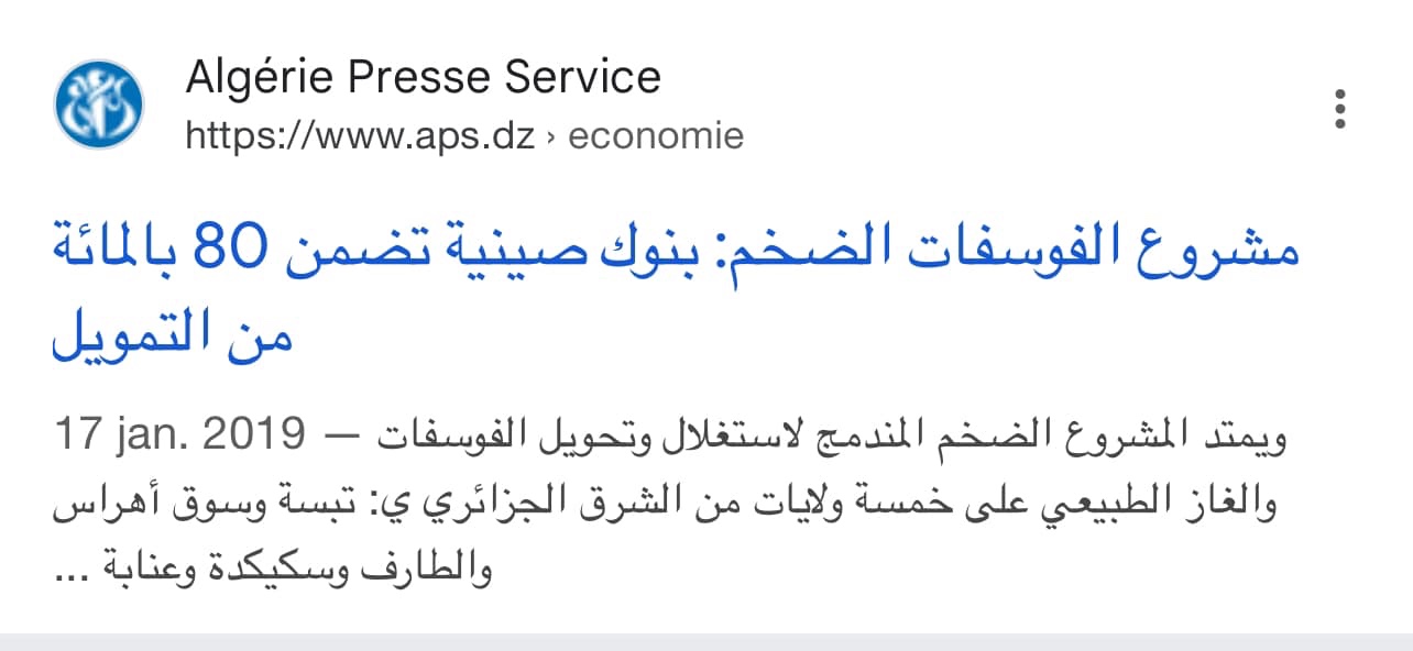 وارتباطا بالموضوع، كان مجمع "أسميدال"، التابع لشركة "سوناطراك" الجزائرية، قد أعلن في أعقاب زيارة الرئيس "تبون" إلى الصين السنة الماضية، عن توقيع اتفاقية مع شركتين صينيتين، بهدف إنشاء شركة ذات أسهم خاضعة للقانون الجزائري، بغية الشروع في الأنشطة الأولية المتعلقة بتطوير مشروع الفوسفاط المدمج.