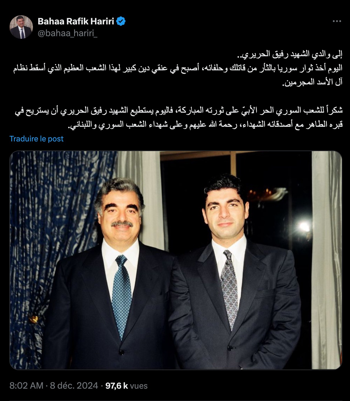 في ذات السياق، نشر نجل الرئيس اللبناني السابق، تغريدة عبر حسابه الخاص على منصة "إكس"، جاء فيها: "إلى والدي الشهيد رفيق الحريري.. اليوم أخذ ثوار سوريا بالثأر من قاتلك وحلفائه".
