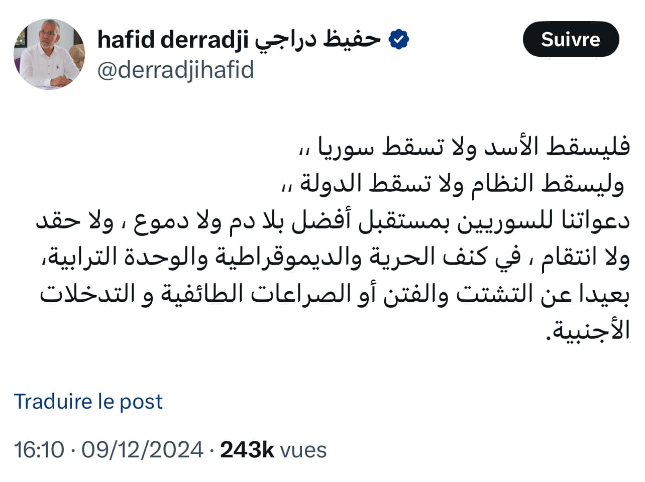 دراجي دونما درة استحياء، نشر تدوينة جديدة عبر حسابه الخاص على منصة (X)، جاء فيها: "فليسقط الأسد ولا تسقط سوريا.. وليسقط النظام ولا تسقط الدولة"، قبل أن يتابع قائلا: "دعواتنا للسوريين بمستقبل أفضل بلا دم ولا دموع، ولا حقد ولا إنتقام، في كنف الحرية والديمقراطية والوحدة الترابية، بعيدا عن التشتت والفتن أو الصراعات الطائفية والتدخلات الأجنبية".