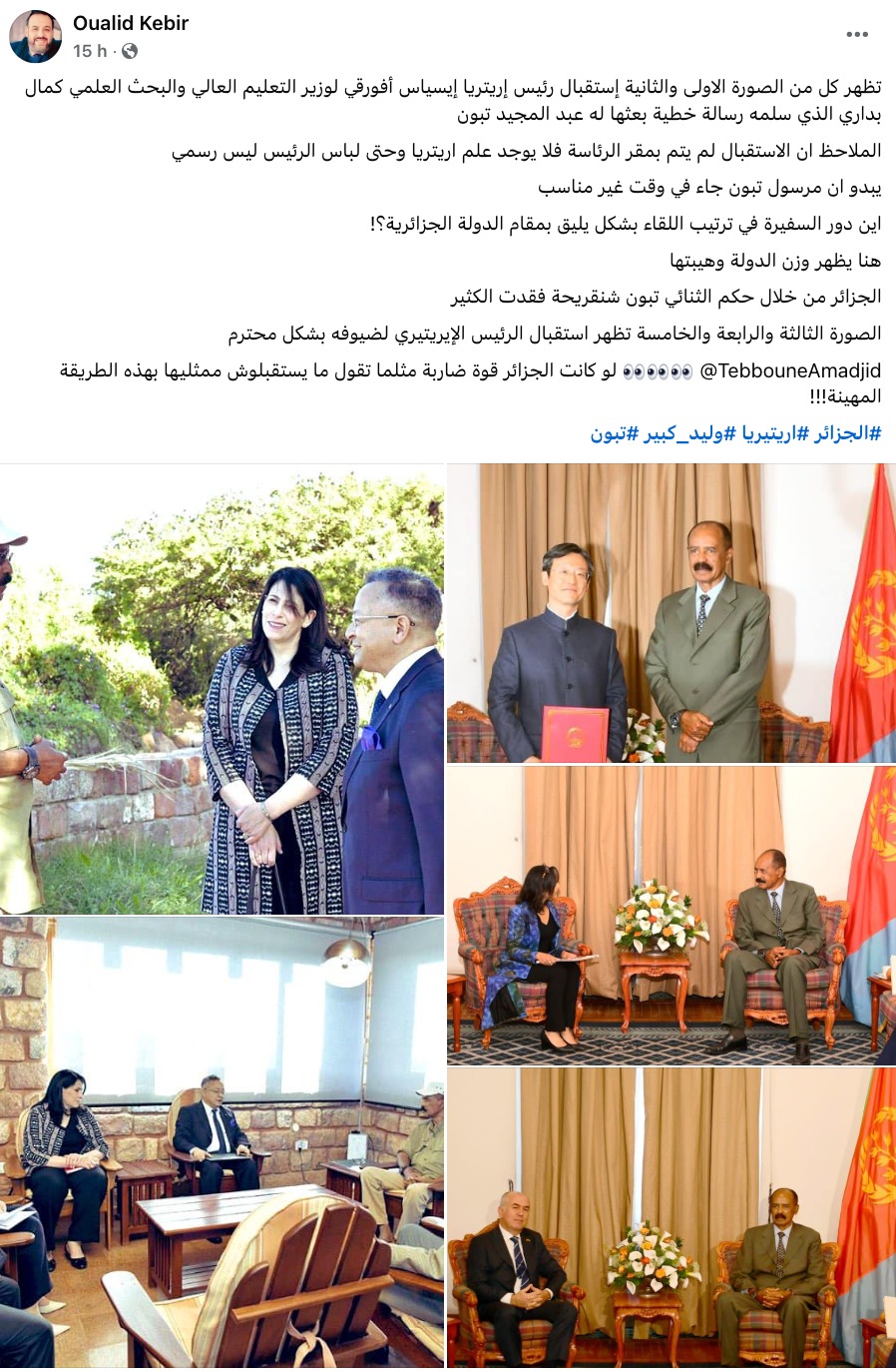 وفي تدوينة ثانية، عرج المعارض الجزائري للحديث عن الطريقة المهينة التي استقبل بها رئيس إريتريا مبعوث "تبون، حيث نشر مجموعة من الصور تؤكد بالملموس أن الأمر كان مقصودا، حيث قال في هذا الصدد: "الملاحظ أن الاستقبال لم يتم بمقر الرئاسة، فلا يوجد علم إريتريا وحتى لباس الرئيس ليس رسمي"، وتابع قائلا: "يبدو أن مرسول تبون جاء في وقت غير مناسب".