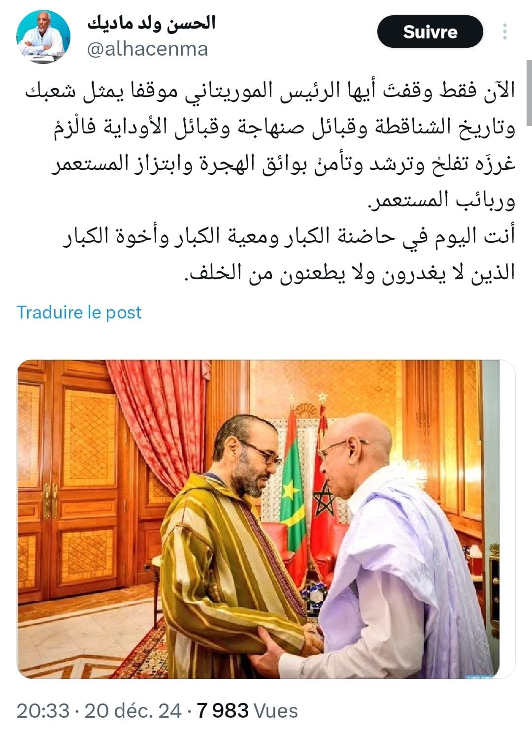 كلام جميل وفي الصميم ونتمنى للشعبين النصر والازدهار فرصة ذهبية بيد الاخوة الموريتانيين للنهوض بالعلاقة المغربية والموريتانية الى الافضل لماهر في صالح الشعبين الشقيقين المغرب بجانبكم ومعكم ويمكن الاعتماد عليه في السراء و الضراء