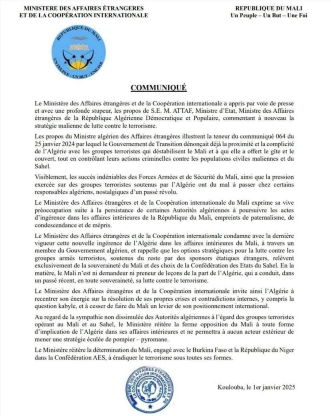 تعيش العلاقات بين الجزائر ومالي توترًا حادًا، إذ تصاعدت الاتهامات المتبادلة بين الطرفين. وفي تطور جديد، نددت باماكو بالدور الجزائري في دعم الجماعات الإرهابية العاملة في مالي ومنطقة الساحل، ردًا على تصريحات وزير الخارجية الجزائري أحمد عطاف، الذي أبدى دعمه للحركات المسلحة الموقعة على اتفاق الوساطة الجزائري، رافضًا وصفها بالإرهابية، وداعيًا للتفاوض معها مستقبلًا.