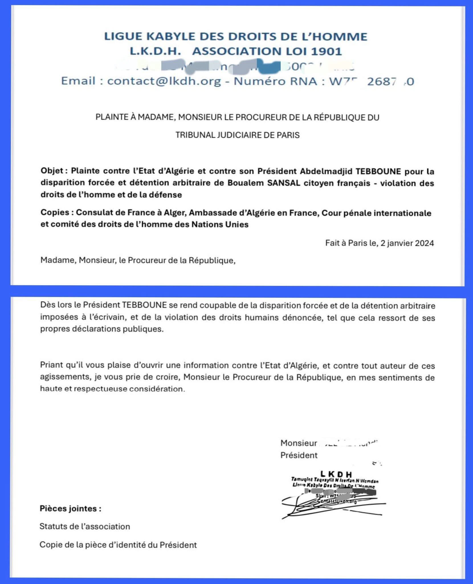أكدت مصادر حقوقية فرنسية أن القضاء الفرنسي ينظر في شكاية جنائية توصل بها في الثاني من يناير الجاري ضد الرئيس الجزائري عبد المجيد تبون، يتهم فيها بالضلوع المباشر في قضية الاختفاء القسري والاعتقال التعسفي للكاتب الفرنسي-الجزائري بوعلام صنصال.