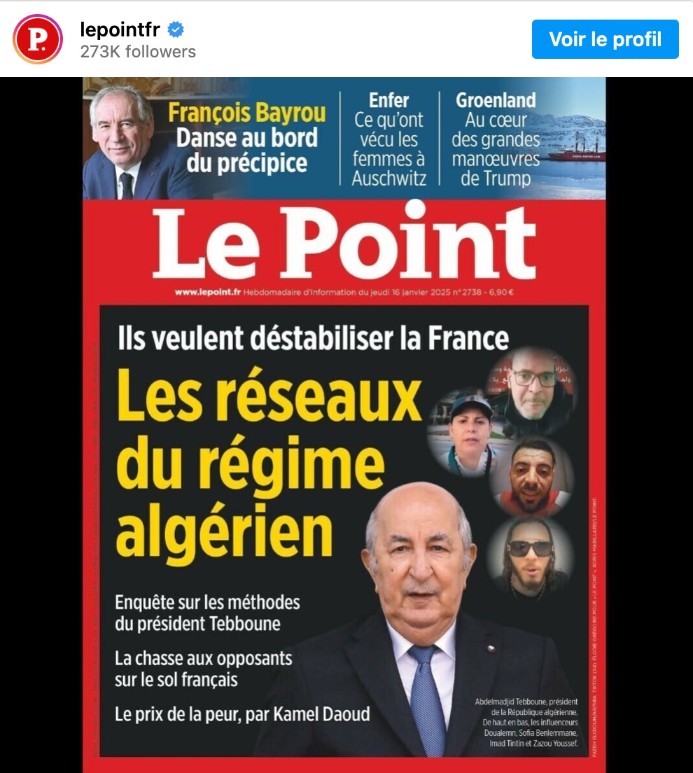 هاجمت مجلة "لوبوان" الفرنسية الجزائر عبر عددها الصادر أمس الخميس، حيث أشارت إلى نظام الكابرانات يوظف عدد من أزلامه (مؤثرين) من أجل زعزعة استقرار أمن فرنسا، مؤكدة أن مؤسسة مسجد باريس الكبير، ورئيسها "شمس الدين حفيظ"، لعبا منذ عام 2020، دورًا سياسيًا في توجيه المهاجرين الجزائريين، سيما خلال الفترة الأخيرة التي اتسمت بكثير من التوتر بين بالجارة الشرقية وباريس، بسبب اعتراف هذه الأخيرة بمغربية الصحراء.