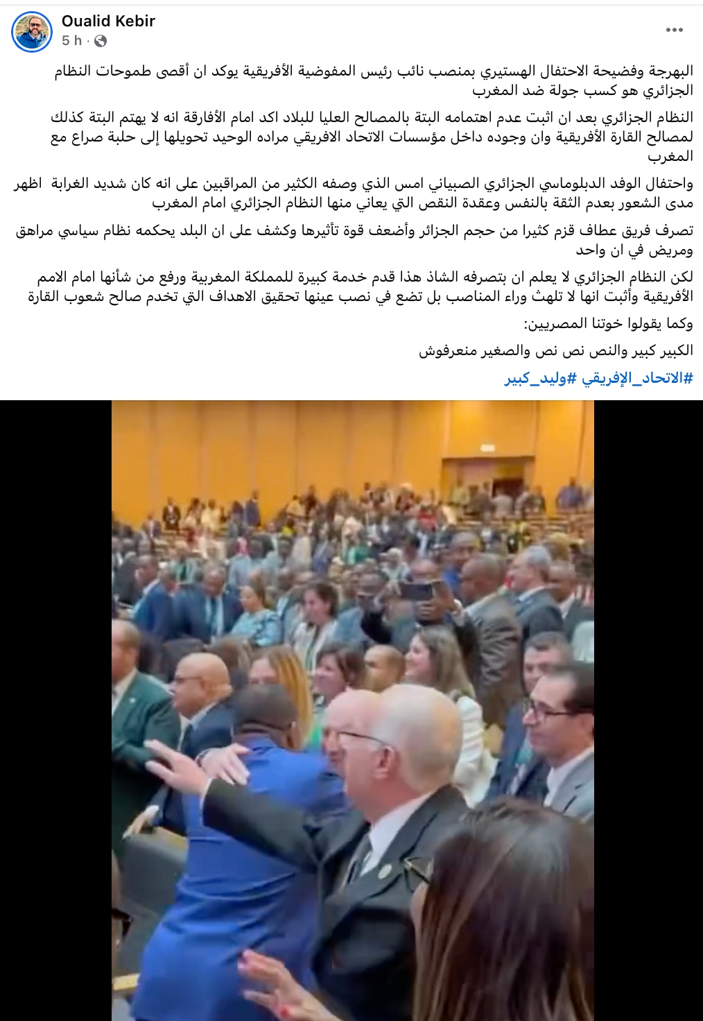 وشدد "كبير" عبر تدوينة نشرها عبر حسابه الفيسبوكي على أن "النظام الجزائري بعد أن اثبت عدم اهتمامه البتة بالمصالح العليا لبلاده، أكد أمام الأفارقة أنه لا يهتم البتة كذلك لمصالح القارة الأفريقية وأن وجوده داخل مؤسسات الاتحاد الافريقي مراده الوحيد تحويلها إلى حلبة صراع مع المغرب".