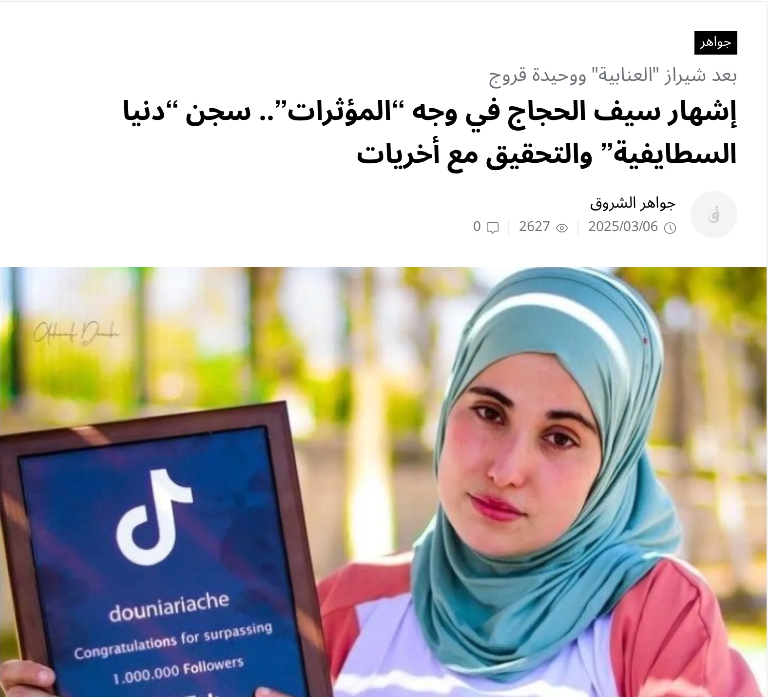 وارتباطا بالموضوع، أشارت صحيفة "الشروق" الجزائرية إلى أن محكمة عين الكبيرة بولاية سطيف، أدانت أمس الأربعاء، المؤثرة "دنيا رياش"، الشهيرة بـ""دنيا السطايفية"، بخمس سنوات سجنا نافذة، وغرامة مالية قدرها 10 ملايين سنتيم، وذلك على خلفية مواجهتها بتهم تتعلق بصناعة محتوى خادش للحياء (روتيني اليومي)، وعرض فيديوهات غير أخلاقية، إلى جانب تورطها في أعمال مشبوهة مثل بيع صور غير لائقة والتوسط في ممارسات غير قانونية.