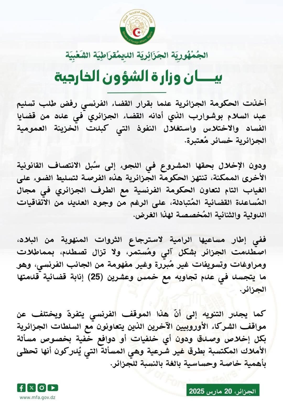 أعربت الجزائر عن استيائها الشديد من قرار القضاء الفرنسي القاضي برفض طلب تسليم وزير الصناعة الأسبق، عبد السلام بوشوارب، الذي أدانه القضاء الجزائري في عدة قضايا فساد واختلاس واستغلال نفوذ، والتي تسببت في خسائر مالية فادحة لخزينة الدولة.