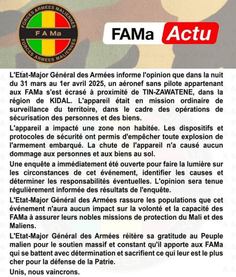 غير أن هذا الإعلان الجزائري سرعان ما ووجه بتطور جديد قلب معطيات القضية رأسا على عقب، حيث خرجت الأركان العامة للجيوش المالية ببيان رسمي يوضح أن الطائرة المستهدفة تابعة للقوات المسلحة المالية، وكانت في مهمة استطلاعية روتينية ضمن عمليات تأمين الحدود والممتلكات، مشيرا إلى أن الطائرة تحطمت في منطقة غير مأهولة، كما أكد أن جميع التدابير الأمنية حالت دون وقوع أي انفجار للأسلحة المحمولة على متنها، كما لم تتسبب الحادثة في أي أضرار بشرية أو مادية.