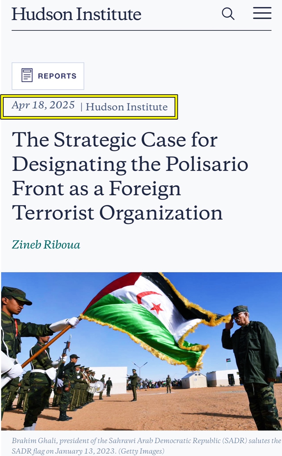 في تقرير صدر عن معهد "هادسون" الأمريكي للأبحاث بتاريخ 18 أبريل 2025، تطرقت الباحثة "زينب ريبوع" إلى التحولات العميقة التي تشهدها جبهة البوليساريو، معتبرة أنها تجاوزت طابعها الانفصالي التقليدي لتصبح فاعلًا غير دولتي يتقاطع مع أجندات قوى إقليمية ودولية معادية للاستقرار.