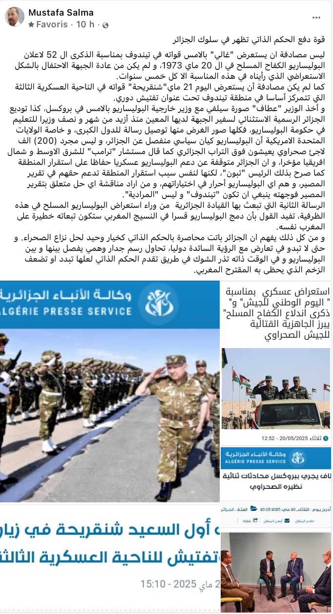 ما يثير الانتباه بحسب ما أوضحه "مصطفى سلمى" عبر تدوينة نشرها على حسابه الفيسبوكي، هو توقيت هذه التحركات والسياق الدولي الذي تندرج فيه. فالعالم لم يعد يناقش مستقبل الصحراء في ضوء الأطروحات القديمة، بل بات الحكم الذاتي تحت السيادة المغربية هو الطرح الوحيد الذي يحظى بالزخم والدعم الحقيقيين. في المقابل، تجد الجزائر نفسها مضطرة إلى إعادة صياغة تموقعها من الملف، لا بالتراجع العلني، بل عبر رسم مسافة شكلية بينها وبين البوليساريو، محاولةً بذلك أن توهم المجتمع الدولي بأن الجبهة تتحرك بإرادتها المنفصلة، وأن الجزائر لا تتدخل في خياراتها، رغم أن كل المؤشرات الميدانية والسياسية تقول العكس.