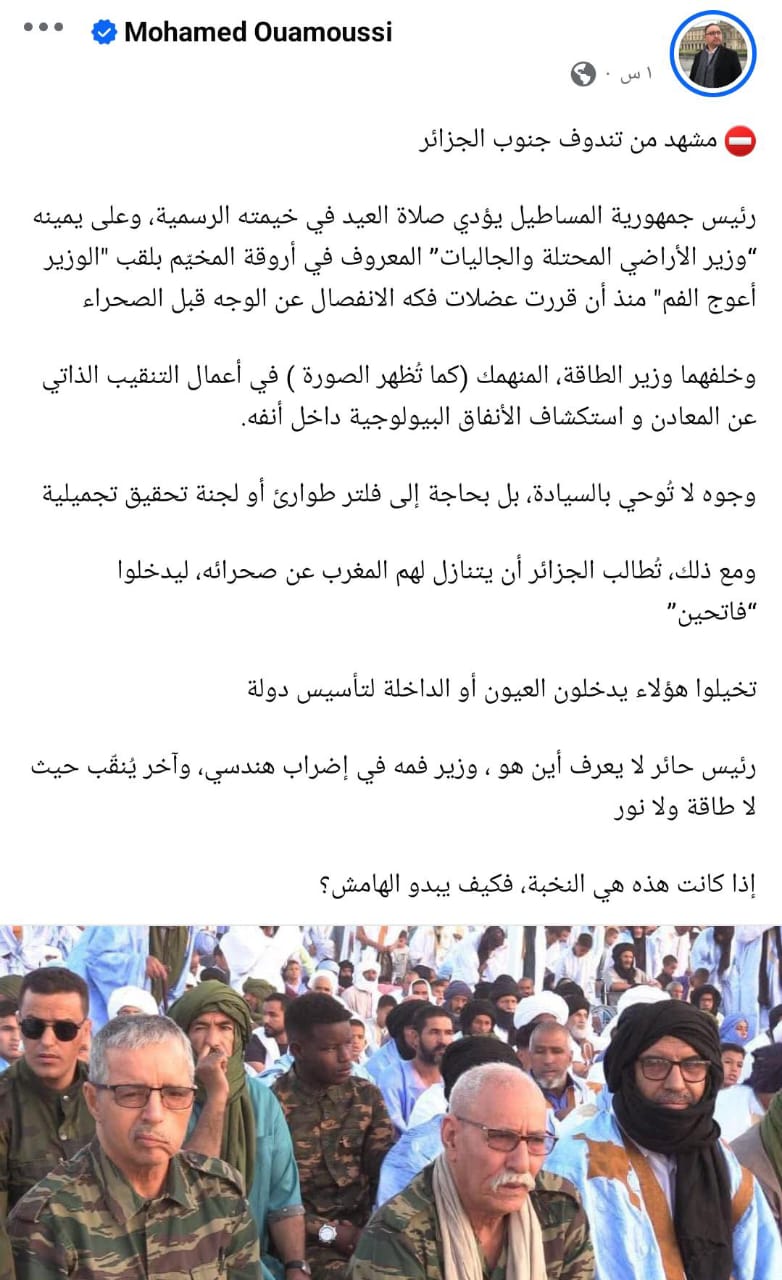 وفي تعليق ساخر على تفاصيل الصورة، كتب واموسي: "رئيس جمهورية المساطيل يؤدي صلاة العيد في خيمته الرسمية، وعلى يمينه وزير الأراضي المحتلة والجاليات، المعروف في أوساط المخيم بلقب 'الوزير أعوج الفم'، منذ أن قررت عضلات فكه الانفصال عن الوجه قبل الصحراء. وخلفهما وزير الطاقة، المنهمك كما تُظهر الصورة في أعمال التنقيب الذاتي عن المعادن واستكشاف الأنفاق البيولوجية داخل أنفه".