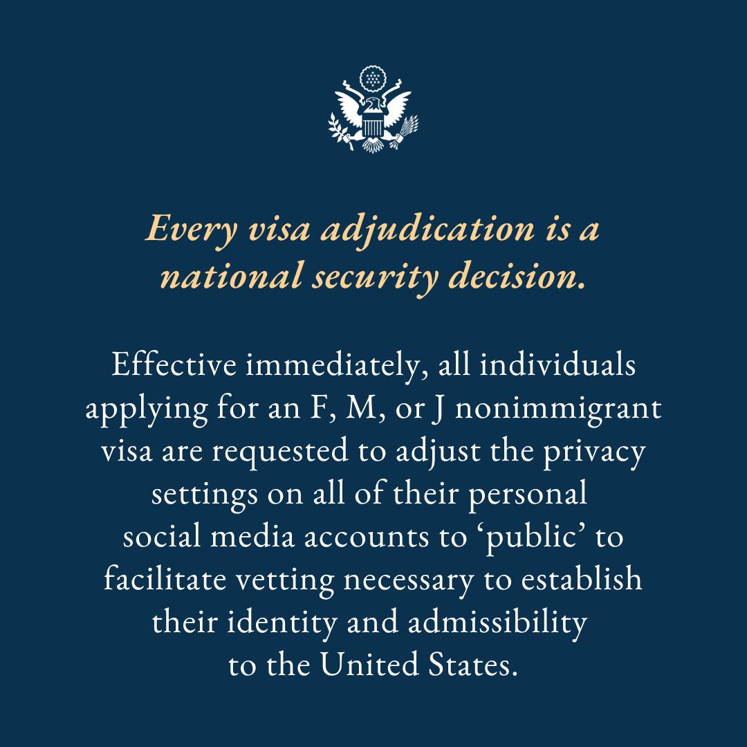 دعت السفارة الأمريكية بالرباط، عبر منشور رسمي على صفحتها بموقع "فيسبوك"، جميع الراغبين في الحصول على تأشيرات F أو M أو J، إلى تعديل إعدادات الخصوصية في حساباتهم على مواقع التواصل الاجتماعي، وجعلها "عامة"، وذلك بهدف تسهيل عملية التحقق من الهوية والأهلية القانونية لدخول الأراضي الأمريكية.