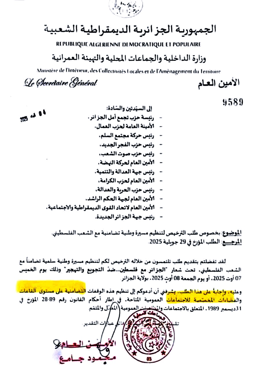 بينما لا تتوقف أبواق النظام الجزائري عن التشدق بدعم "غير مشروط" للقضية الفلسطينية، تكشف وثيقة رسمية صادرة عن وزارة الداخلية الجزائرية حجم التناقض الصارخ بين الخطاب والشعارات من جهة، والممارسة السلطوية على الأرض من جهة أخرى. الوثيقة المؤرخة في 4 غشت 2025 والموجّهة إلى عدد من أمناء الأحزاب السياسية، تفضح بوضوح هذا الزيف، بعد أن طالب وزير الداخلية محمود جامع صراحةً عدم تنظيم أي مسيرة أو تظاهرة شعبية في الشارع دعما لفلسطين، وحث على الاكتفاء بأشكال "رمزية" داخل قاعات مغلقة.
