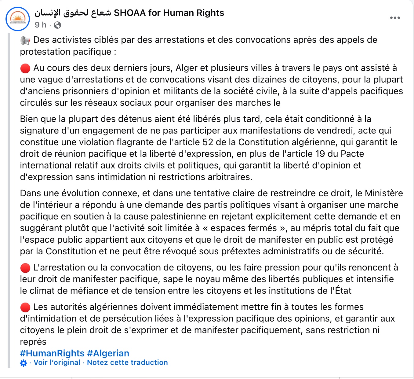 أصدرت منظمة شعاع لحقوق الإنسان، وهي منظمة حقوقية دولية مقرها في لندن بالمملكة المتحدة وتعمل على دعم وحماية حقوق الإنسان داخل الجزائر -أصدرت- بلاغًا حذرت خلاله من تصاعد عمليات الاعتقال والاستدعاء التي طالت عشرات الناشطين المدنيين في الجارة الشرقية للمغرب.