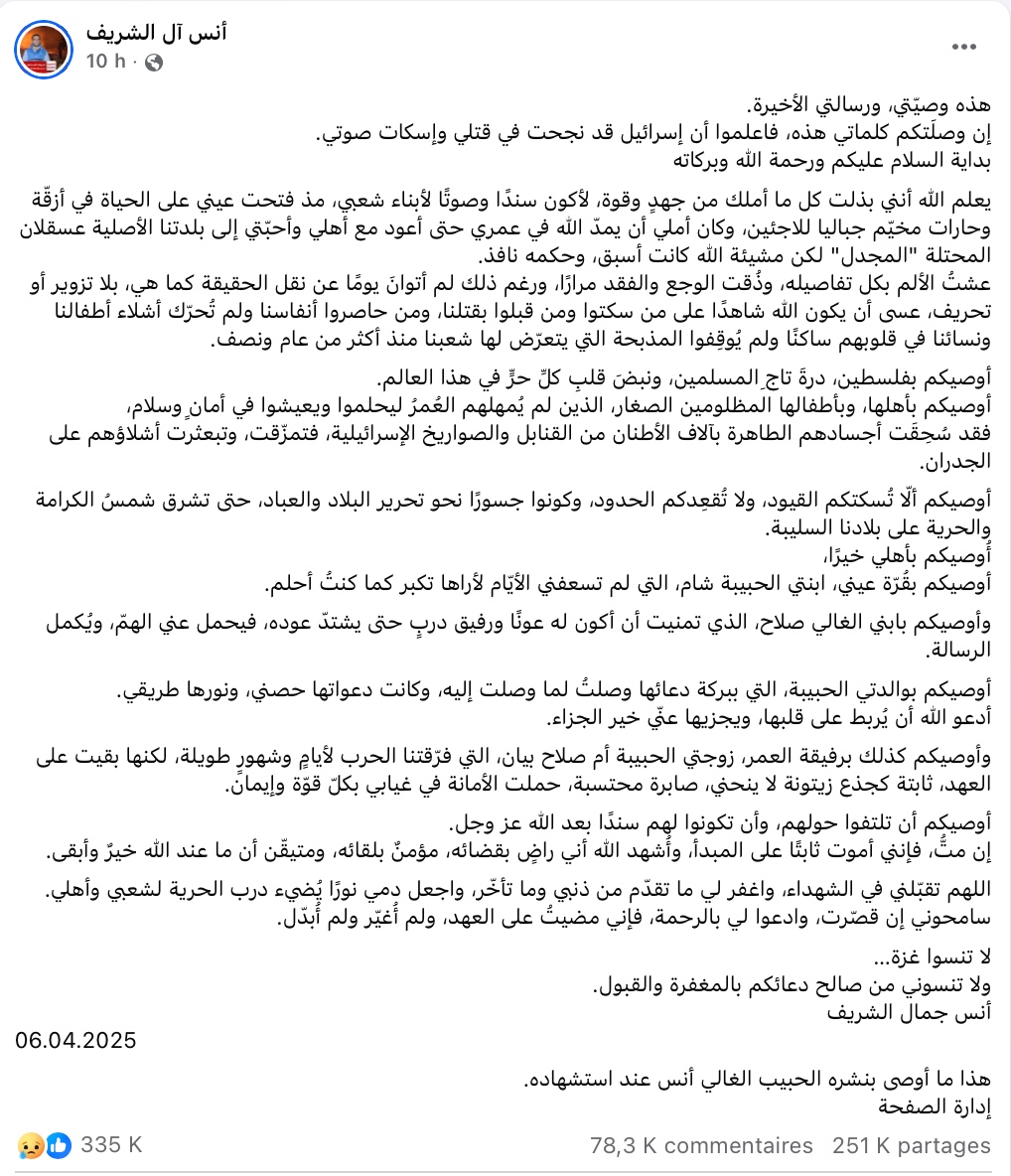 الوصية التي كتبها الشهيد يوم 6 أبريل 2025، ونشرتها إدارة صفحته على الفيسبوك مباشرة بعد رحيله، افتتحها بعبارة تهز القلب: "إن وصلَتكم كلماتي هذه، فاعلموا أن إسرائيل قد نجحت في قتلي وإسكات صوتي". وضع القارئ منذ السطر الأول أمام حقيقة الرحيل الذي كان يتوقعه، لكنه لم يره هزيمة، بل ختمًا لمسيرة الوفاء للمبدأ.