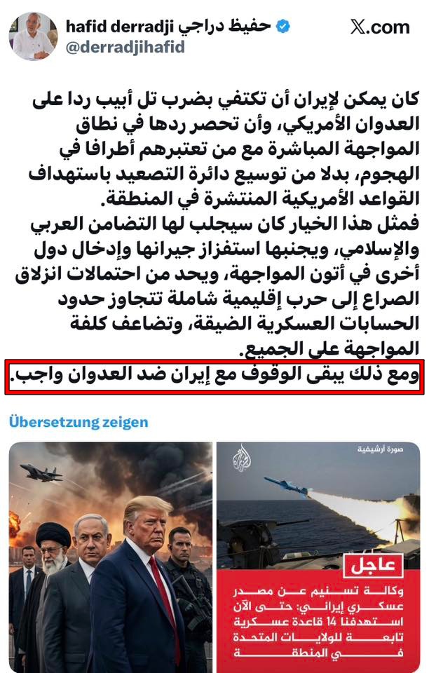 وبالعودة إلى سقطة "دراجي" التي أثارت جدلا واسعا، فقد كتب "بوق الكابرانات" في تغريدته أنه كان يمكن لإيران أن "تكتفي بضرب تل أبيب" ردًا على ما وصفه بـ"العدوان الأمريكي"، وأن تحصر ردها في نطاق المواجهة المباشرة، قبل أن يختم رسالته بالقول إن "الوقوف مع إيران ضد العدوان واجب". هذه العبارة تحديدًا فجّرت سيلًا من الانتقادات، واعتبرها كثيرون انحيازًا صريحًا لطرف قام بقصف دولٍ شقيقة، في مقدمتها قطر التي يعيش ويعمل فيها.