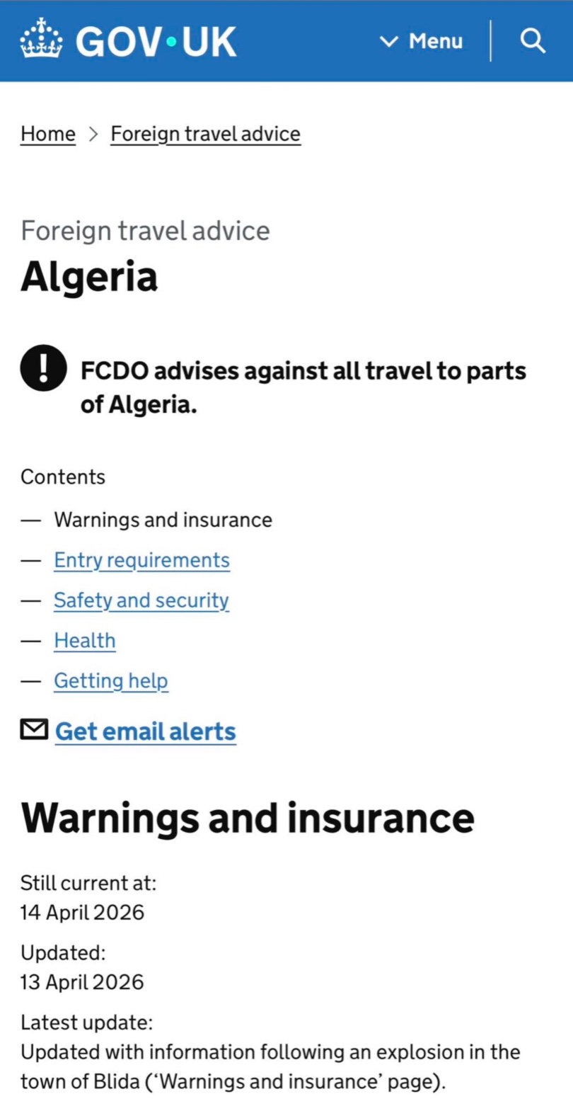 أصدرت وزارة الخارجية البريطانية تحذيرًا مُحدّثًا بشأن السفر إلى الجزائر، في أعقاب الانفجارات التي اهتزت على وقعها مدينة البليدة (جنوب العاصمة) أمس الإثنين بالتزامن من زيارة البابا ليون الرابع عشر.