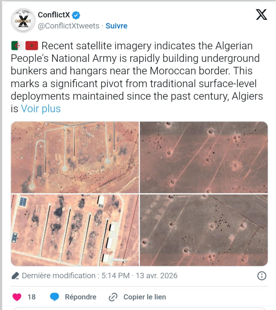 كشفت صور الأقمار الصناعية الأخيرة عن تحول استراتيجي في تحركات الجيش الوطني الشعبي الجزائري بالقرب من الحدود المغربية، حيث باشرت الجزائر بناء سلسلة من البنكرات (المخابئ المحصنة) والحظائر تحت الأرضية. ويمثل هذا التوجه حساب منصات عسكرية على مواقع التواصل قطيعة مع أسلوب الانتشار التقليدي فوق سطح الأرض الذي اعتمدته الجزائر منذ عقود، مما يشير إلى تكييف سريع لعقيدتها الدفاعية مع التهديدات الحديثة.