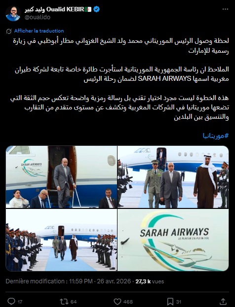 وعلاقة بالموضوع، قال المعارض الجزائري وليد كبير في منشور بموقع "إكس" أن "هذه الخطوة ليست مجرد اختيار تقني بل رسالة رمزية واضحة تعكس حجم الثقة التي تضعها موريتانيا في الشركات المغربية وتكشف عن مستوى متقدم من التقارب والتنسيق بين البلدين.